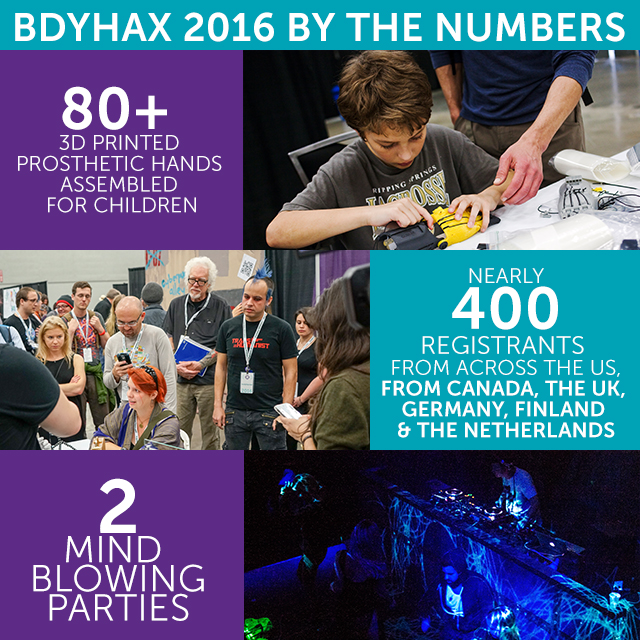 BodyHacking Con isn’t just about implantable technology, it’s about anything you can do to your body to be your more ideal self. However a bodyhacker decides to physically alter or improve their mind or body, there’s always more to discover, learn, teach, synthesize, and celebrate. In 2016, our aim was to make BDYHAX the place where all that happened.
