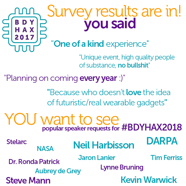 Share us on Twitter @BodyHackingCon and on Facebook at facebook.com/BodyHackingCon. Show your friends our talks on YouTube and let any companies you work with know that you’d like to see them in Austin in 2018!
