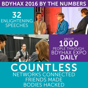 BDYHAX is our full, 2 day conference in Austin, Texas and includes invited international and national speakers on a broad selection of topics as well as talks accepted from our Call for Research submissions about the newest research in human augmentation. BDYHAX also includes The Hub, featuring expo booths, product demos, and other great stuff and our Saturday night cyberpunk dance party, The Wormhole.